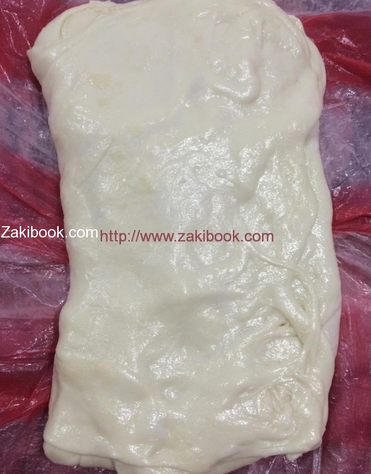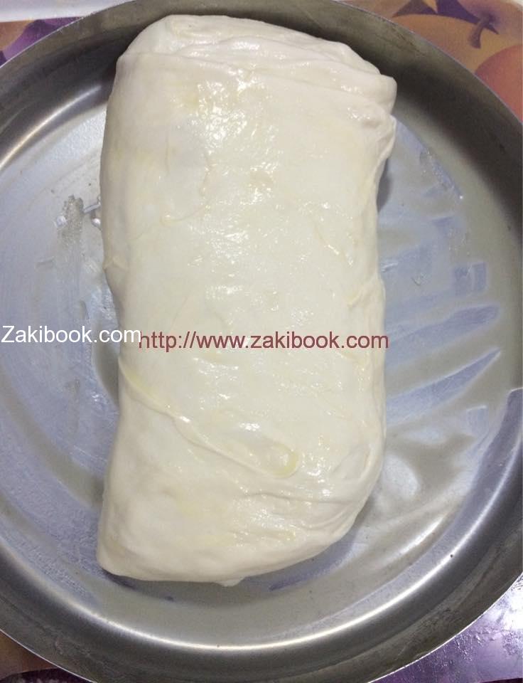 هتضعيها بصنيه مدهونه سمن كويس وعلى وشها سمن وهتسبيها ترتاح نص ساعه وبعد كده افرديها فى الصنيه ودخليها فرن ساخن والف هنا.