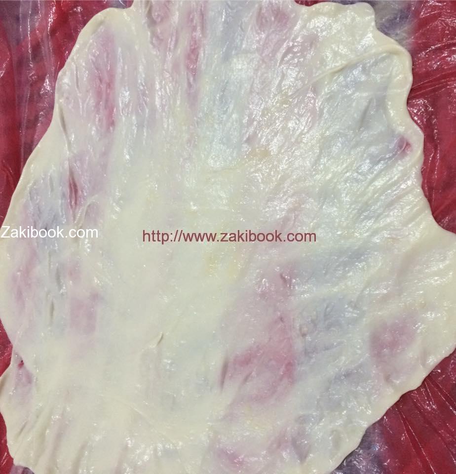2) بطبقي العجينتين كما في الصورة, ثم تحضير عجينة ثالثة وتضعيها أسفل العجينتين اللتان قمنا بتطبيقهم.