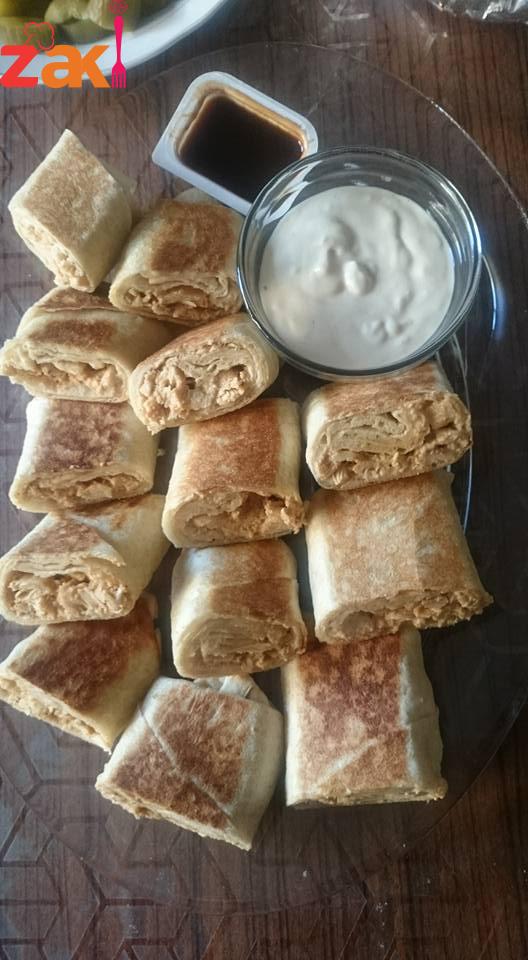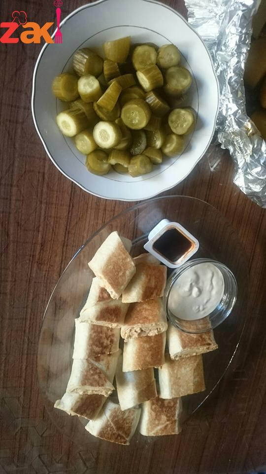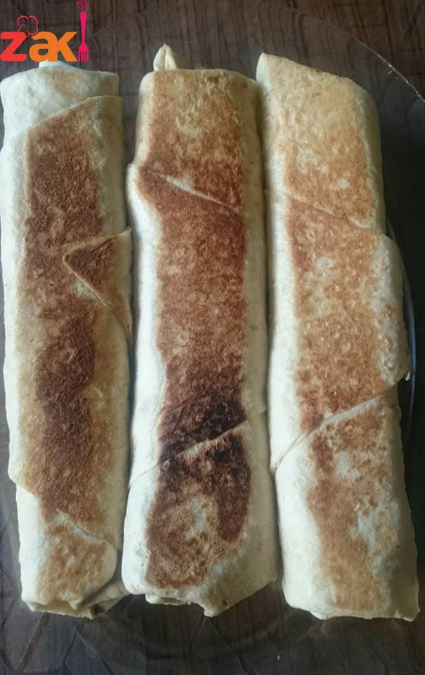 بس يبرد ادهن الخبز مايونيز و حط كمية من الدجاج و البطاطا المقلية و لفها و ع grill حمصها و قطعها و بجنبها مخلل و بيبسي و سلطة و صحتين