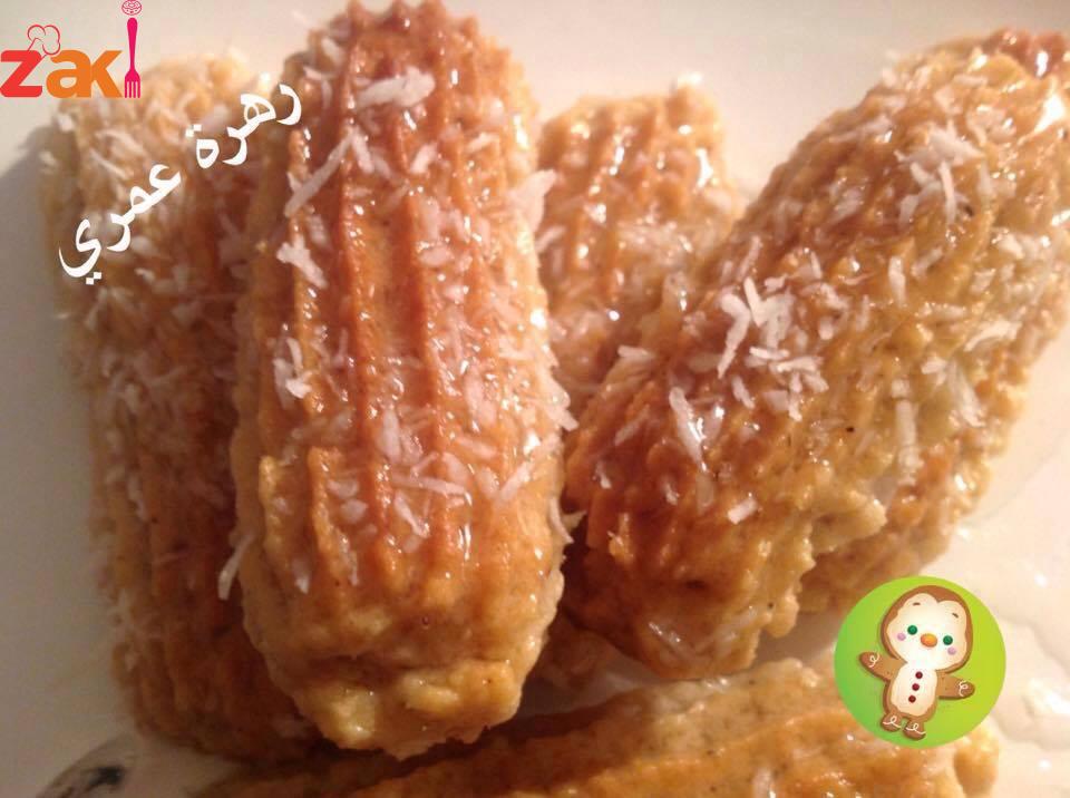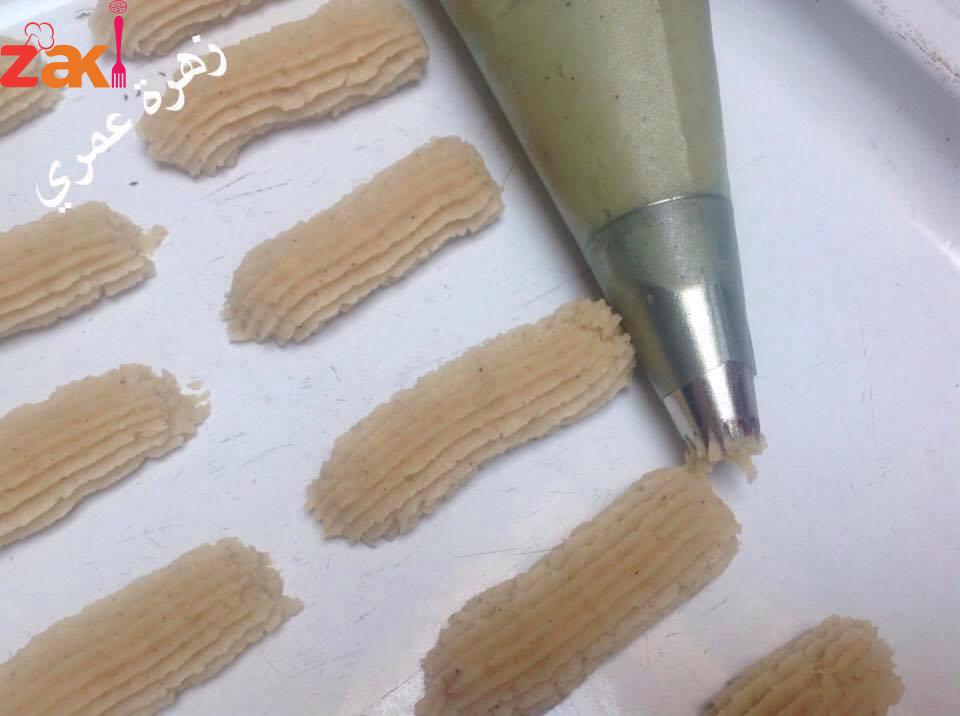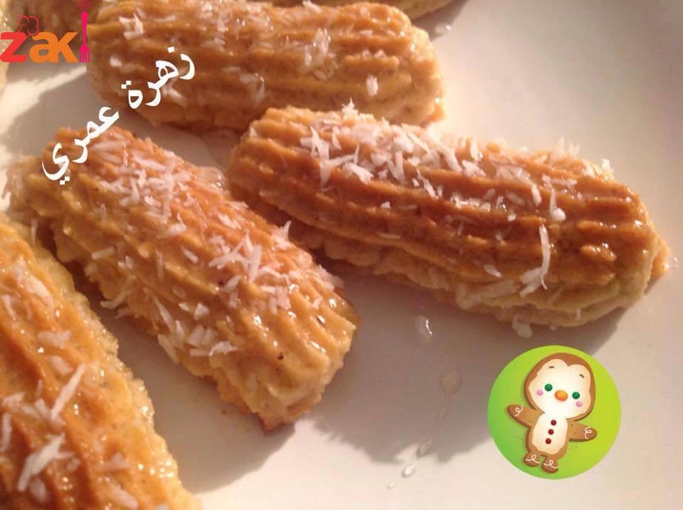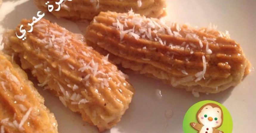 كوب /زبدة لينة/كوب عصير لوز مركز/نص كوب زيت/ربع كوب نشا/ملعقة صغيرة قرفة/ظرف بيكنبودر /قطرات من روح اللوز/ذرة ملح/دقيق مايعجن غير يابسة ولا رطبة حطيها في كيس حلواني زي الصورة تحمر في الفرن خليها تبرد وعسليها ورشي عليها جوز هند
