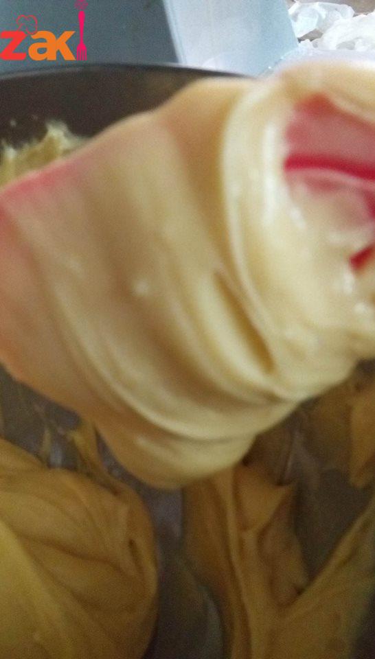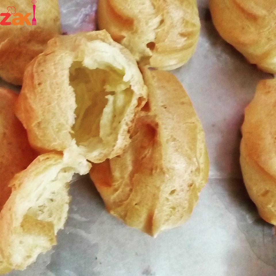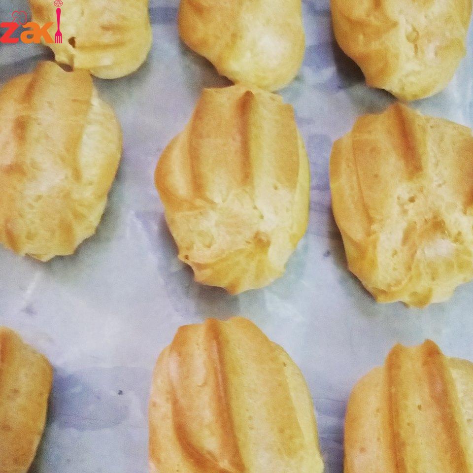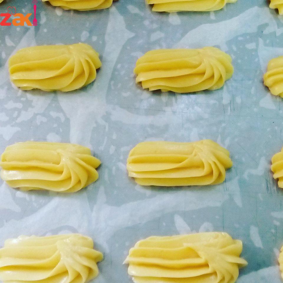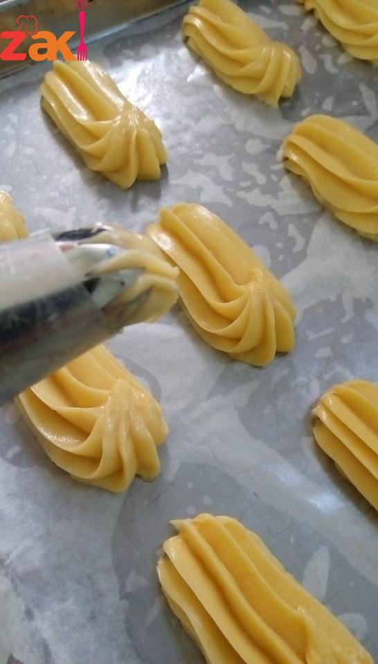 يوضع الماء… الزبدة…. السكر….. وزرة الملح في قدر ويوضع القدر علي النار الي ان يغلي الماء ثم يضاف الدقيق مرة واحدة اي دفعة واحدة ويقلب علي نار هادئة الي ان تتكون عجينة من كتلة واحدة وتترك الي ان تبرد تماما ثم بعد ذلك يضاف البيض بيضة واحدة وتقلب الي ان تختفي البيضة ثم تضاف البيضة الثانية وتضرب الي ان تختفي وهكذا الي ان يخلص مقدار البيض ( قوام العجين لزج اي مطاطي) ثم تضاف الفانيليا اخر شي ثم يوضع في كيس حلواني ويشكل كما موضح في الصور
