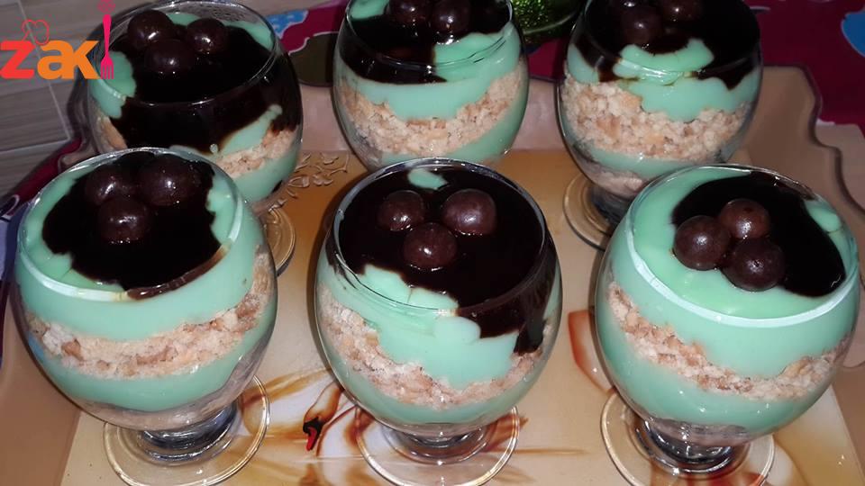 ٢٥٠بسكويت سادة ٥٠غرام زبدة ٤موز حجم كبير صوص شوكولا كاسترد بطعم الموز بعد تفتيت البسكوت نذوب الزبدة وبنوزعه عالبسكوت لحتى يتماسك.نضع في الكاسات صوص وطبقة بسكوت بعدها طبقة شرايح موز.بيكون الكاسترد جاهز نضع طبقه منه ثم طبقة بسكوت وطبقة كاسترد ونزين بصوص الشوكولا.