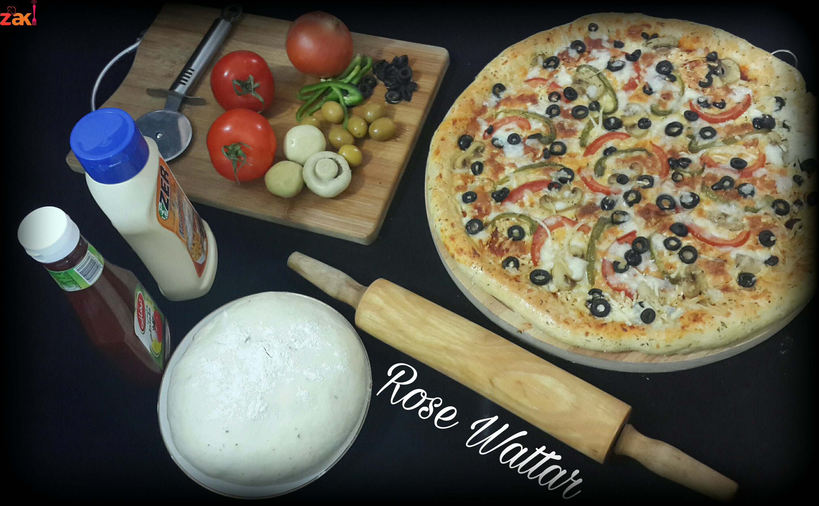 تخلط المواد الجافه معا ويضاف الماء بالتدريج إلى أن تعجن واخيرا يضاف الزيت ويعجن بيه جيدا تغطى إلى أن يتضاعف الحجم تقسم الى قسمين وتكور ورشه طحين ع الطاوله وتمد ع شكل دائره تطوى الحواف الى الداخل اول شي نضع الصوص البيتزا (معجون طماطا مع قليل من الزيت وع النار ورشة فلفل اسود وبودرة الثوم وبودره البصل) وأي نوع جبن وشرايح طماطا وبصل وفلفل رومي وفطر وزيتون شرايح واخيرا جبن موزريلا تمسح الحواف بالبيض تشوى ع فرن حامي مسبقا 180 من تحت تحمر الحواف وبعدين من الاعلى وصحتين وعافيه