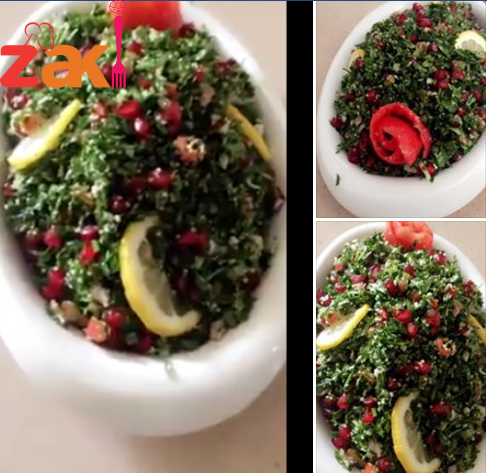 نفرم جميع المكونلت وتخلط جيدا. ثم يضاف البرغل المنقوع وحبات الرمان ونزين الطبق وصحتين