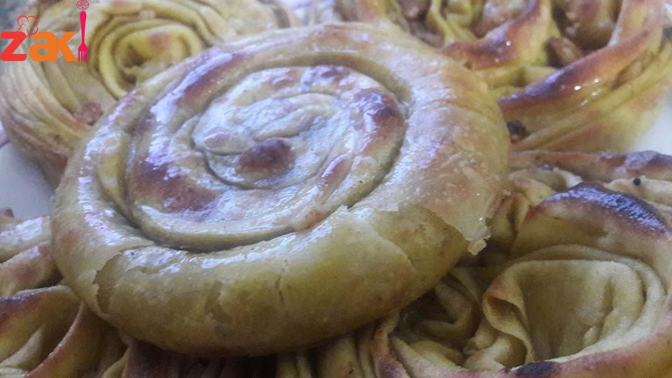 وبعدها برش شوية زيت وبرش جوز مع قرفه وبتلفيها بالشكل الي بدك اياه او بتطبيقها تطبيق وبعدها ع الفرن من تحت ومن فوق وع القطر فورا شكل الداوائر