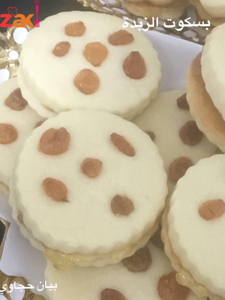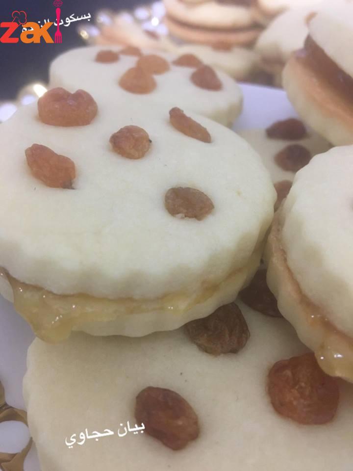 وتترك بالثلاجة ساعة تقطع وتشكل وتوضع حبات من الزبيب تدخل الفرن مدة ١٠ الى ١٢ دقيقة بعد أن تبرد تحشى بالمربى صحة وهنا
