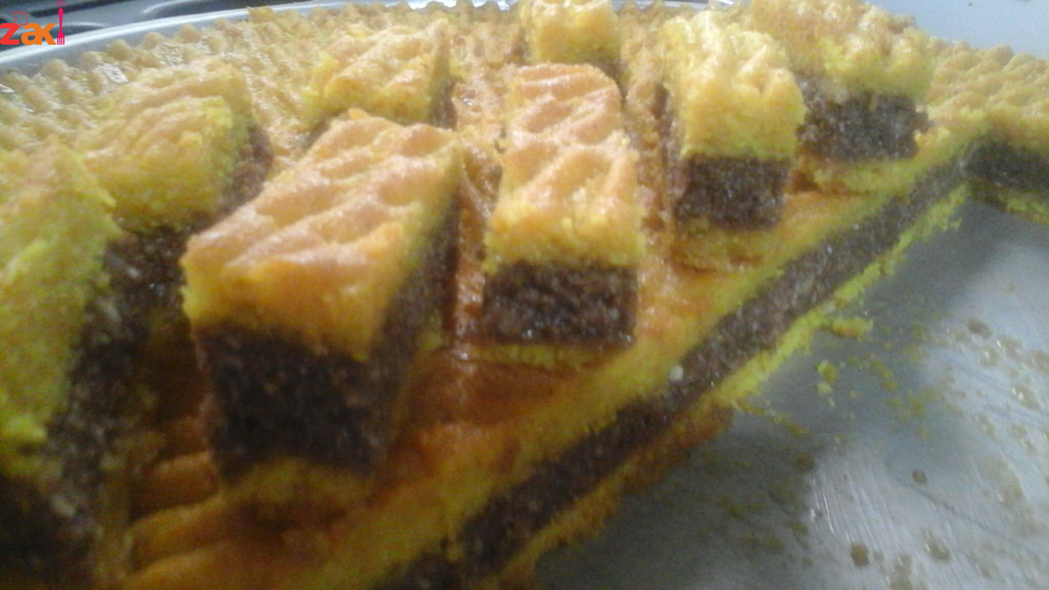 نأتي بالسدر نضع نصف العجينه ونفردها طبقه أولى وبعدين نضع عليهاالحشوه ونفردها جيدا مع الضغط عليها جيدا حتى تتماسك مع بعض ناتي بباقي العجينه الأولى ونفردها قطعه قطعه على كيس نايلون ونضعها على الوجه حتى ننتهي من فردها على الوجه كامل
