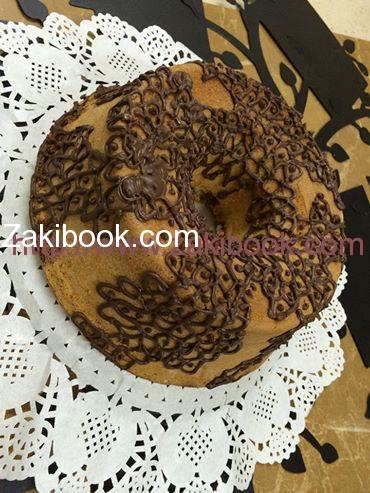 – بعد ما يستوي الكيك, نتركه يبرد, قم قمت بتذويب الشكولا ووضعها في كيس ورسمت على الكيك يشبه رسم الحناء على اليد, وصحة وألف هنا.