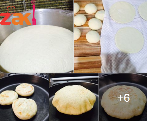 تم تقطع الي كرات تفرد رقيقه شوي وتوضع علي منديل نظيف مع رش شوي طحين وتفرد بالطحين كمان وتترك تخمر مره تانيه وتساويه بالطاسه تفضلي تقلبي فيه لحد ماينفش ويدهن بشوي زيت ويترك ياخد لون احمر حلو وهاكدا حتي نهايه كل الكميه