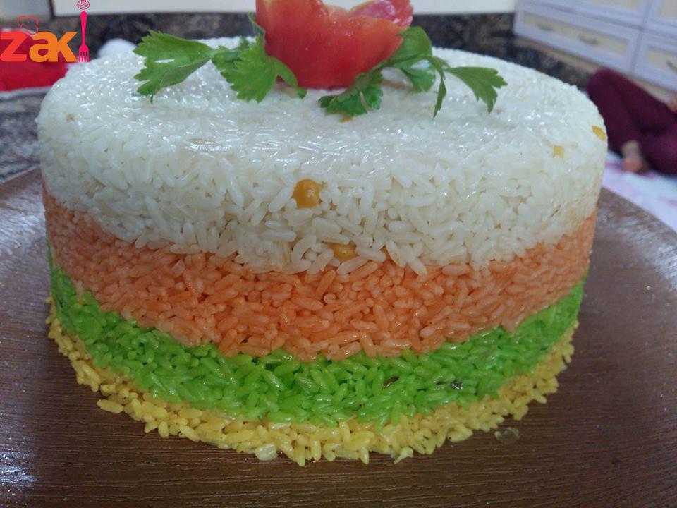 نحضر قالب ويفضل ان يكون مناسب لكمية الارز المطبوخ ثم نضع الارز الابيض ونكبس عليها بشكل قوي ومتساوي ثم الطبقة الثانية ونوزعها بالتساوي ونضغط عليها بقوة ثم الطبقة الخضراء والطبقة الصفراء..ويزين بالطماطة على شكل الوردة.والف عافية