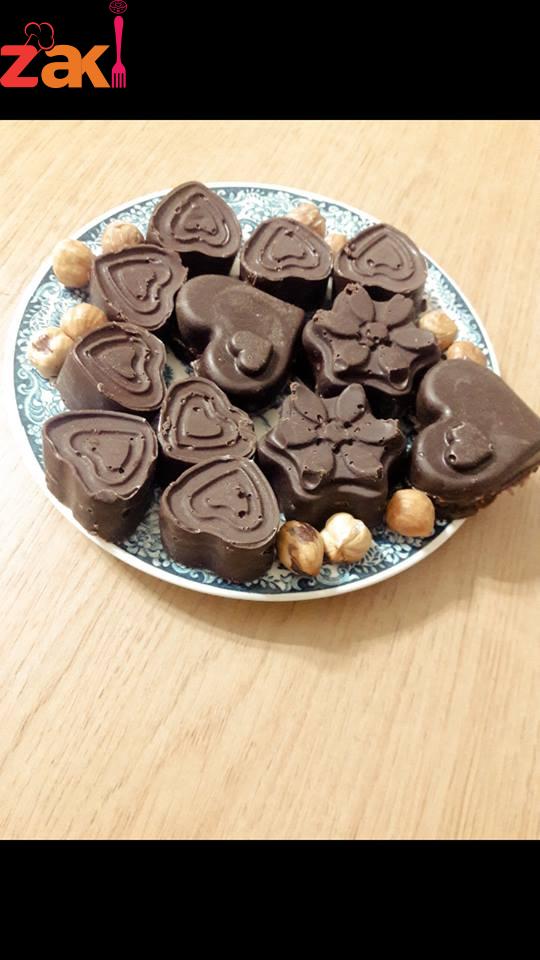 500غ شوكولا علبة حليب مكثف و100 غ زبدة نضعهم في الميكروييف او حمام مائي ليدوب الشوكولا ونحرك وفي قالب سيليكون نضع قليلا من الشوكولا وحبة بندق وشوكولا ونتركها 4 ساعات لتبرد