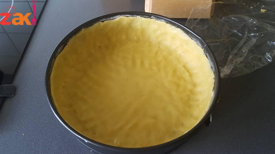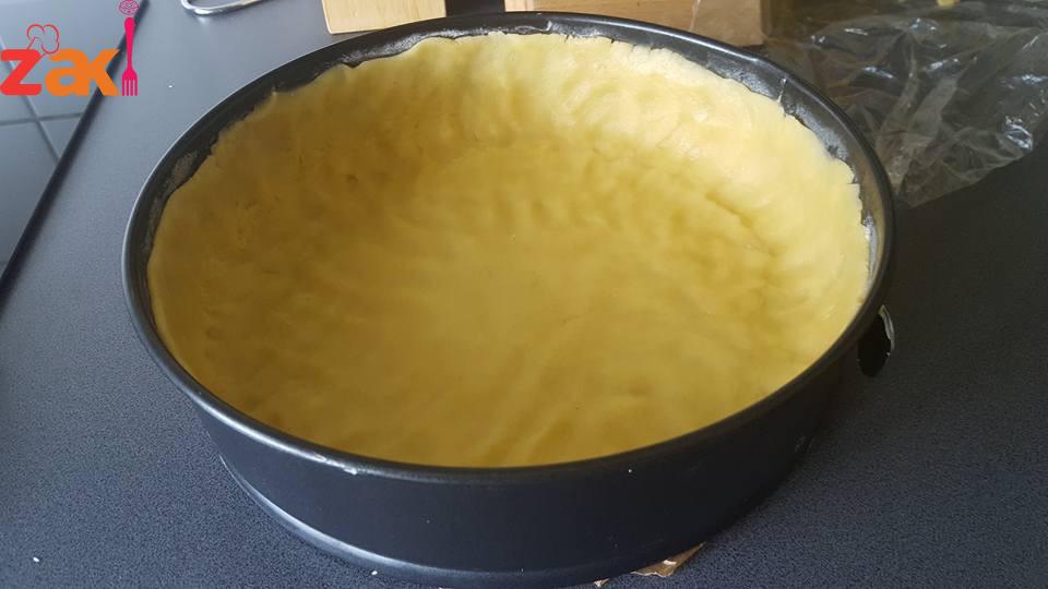 نحضر قالب الحلوى ونضع فى ارضه ورقة زبده (اختياري ) ويتم دهن الجوانب بالزبده وترش طحين ومن ثم نأخد 3/4 العجينة تقريبا وتمد بارض القالب وترص جيدا وباقي العجينة تمد على جوانب القالب بعرض اصبعين