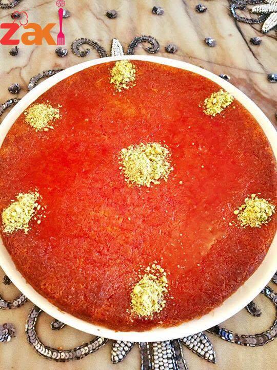وتخبز بحرارة عالية 250 درجه والنار من تحت فقط لمدة بين 20-30 دقيقة او حسب الفرن راح نلاحظ الأطراف تباعدت عن الصينية وأصبحت ناشفة نخرجها نتركها مدة 5-10 دقائق ونقلبها ونسقيها بالقطر الدافئ او البارد