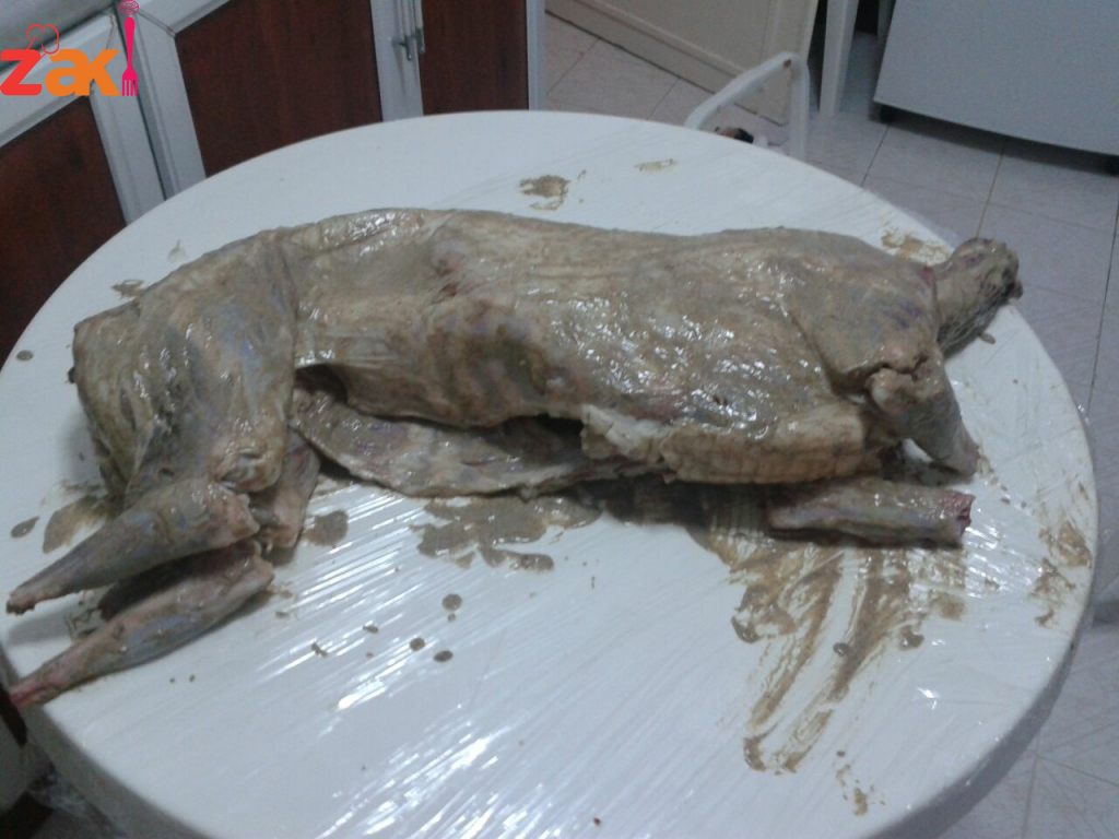 بعدين بتحطي علبة اللبن بزبديه بضيفي عليه معلقه كبيره بهار مشكل ومعلقه كبير قرفه ومعلقه كبيره هيل مطحون ونص نعلقه كبيره فلفل اسود ومعلقه صغيره كركم ومعلقه صغيره زنجبيل مطحون ومعلقتين ونص كبار ملح بتحركيهم منيح وبصله صغيره مبشوره1 وبتدهني الخاروف بالخلطه من جوه وبره منيح وبتسكري النايلون حواليه منيح وبتحطي بالتلاجه لتاني يوم .
