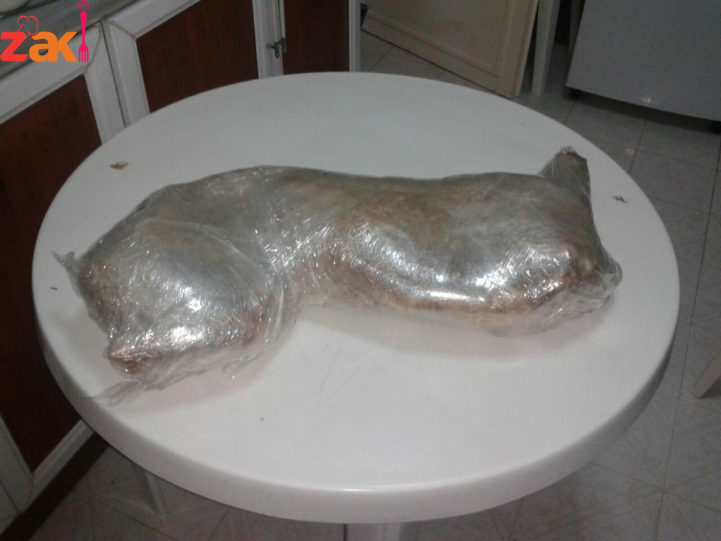 بسم الله اول شي بتبشري بصلتين كبار وبتدعكي الخاروف فيهم من جوه ومن بره وبتتركي نص ساعه بتغسلي منيح منيح وبتنشفي من بره وجوه وبتفردي نايلون (كيلينفل)عدة طبقات على قد الطاوله كامله بتحطي الخاروف فوقها وبتجيبي سكين وبتعملي شقوق باللحم وبكل شق بتحطي شرحة توم كبيره