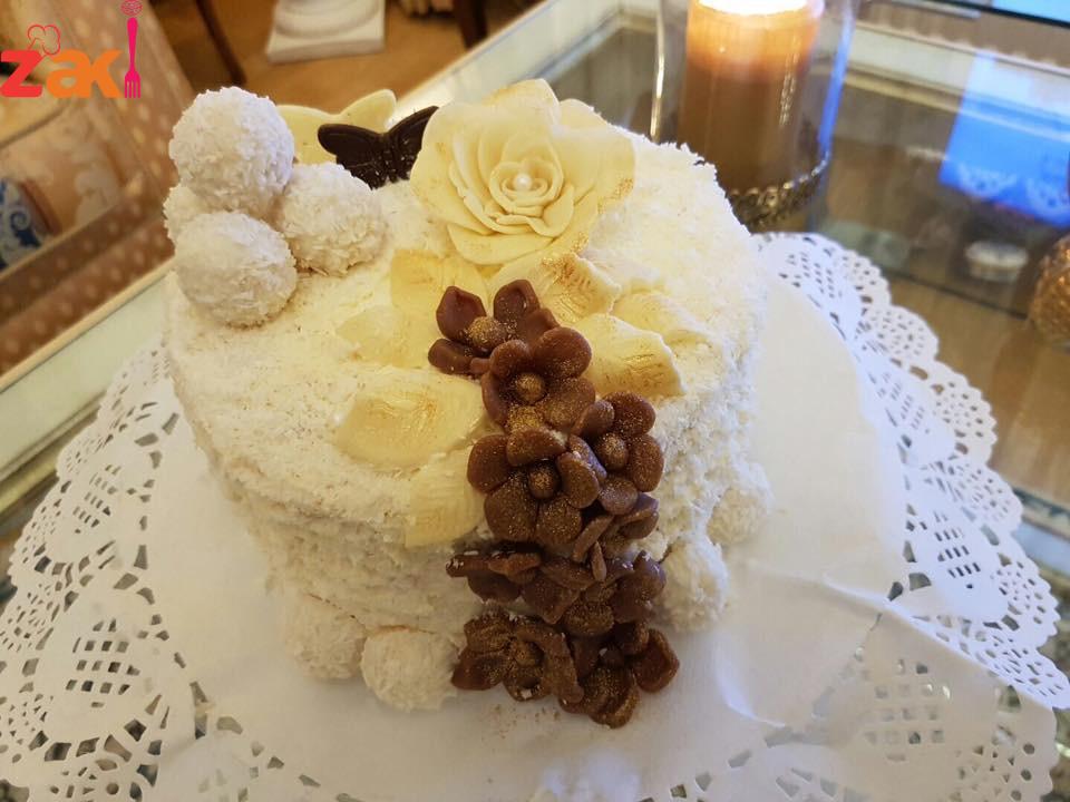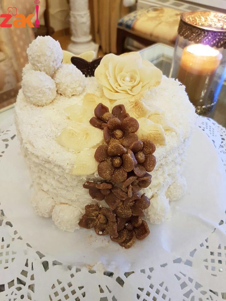 بوردة شكولا بيضا وزهر من عجينة اللوز. تغليف التورته بكريمة الشكولا اليضا مع جوز الهند ومزينة بوردة كبيرة بيضا من الشكولا وزهور بني من عجينة اللوز وحبا ت الشكولا Raffello مع تحياتي لكم بنوع تورته جديد  انتباه التورته حجم صغير واذا بتحبوها حجم اكبر يتضاعف المقادير وشكرا
