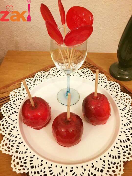 نشيله عن النار نضع الملون الاحمر نحرك ، نغطس التفاحات تقريبا غطسه واحده حتى لاتتكون لدينا طبقه سميكه وتكون خفيفه وقت الاكل ، يفضل وضعها على ورق زبده المستخدم للفرن حتى تجف ولا تلتزق.