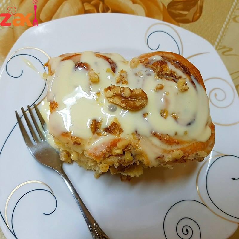وبعدين بفردها مستطيل لسهولة العمل انا بقسمها على مرتين بدهنها زبدة وسكر وقرفة وجوز. عين جمل بنلفها رول وبنقطعها وبنحطها بجاط بنتركها تتخمر كمان مرة لمدة ساعة وبنخبزهالحتى تحمر