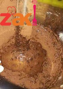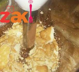 4-نضع الكالتشيو بالبندق طبعاً كل مرة نضع حاجه بنضرب بالهاندبلندر نضع البسكويت المتكسر ونخلط كويس مش مشكله لو حتت صغيرة