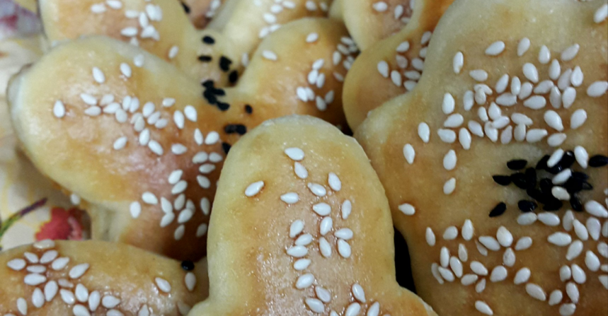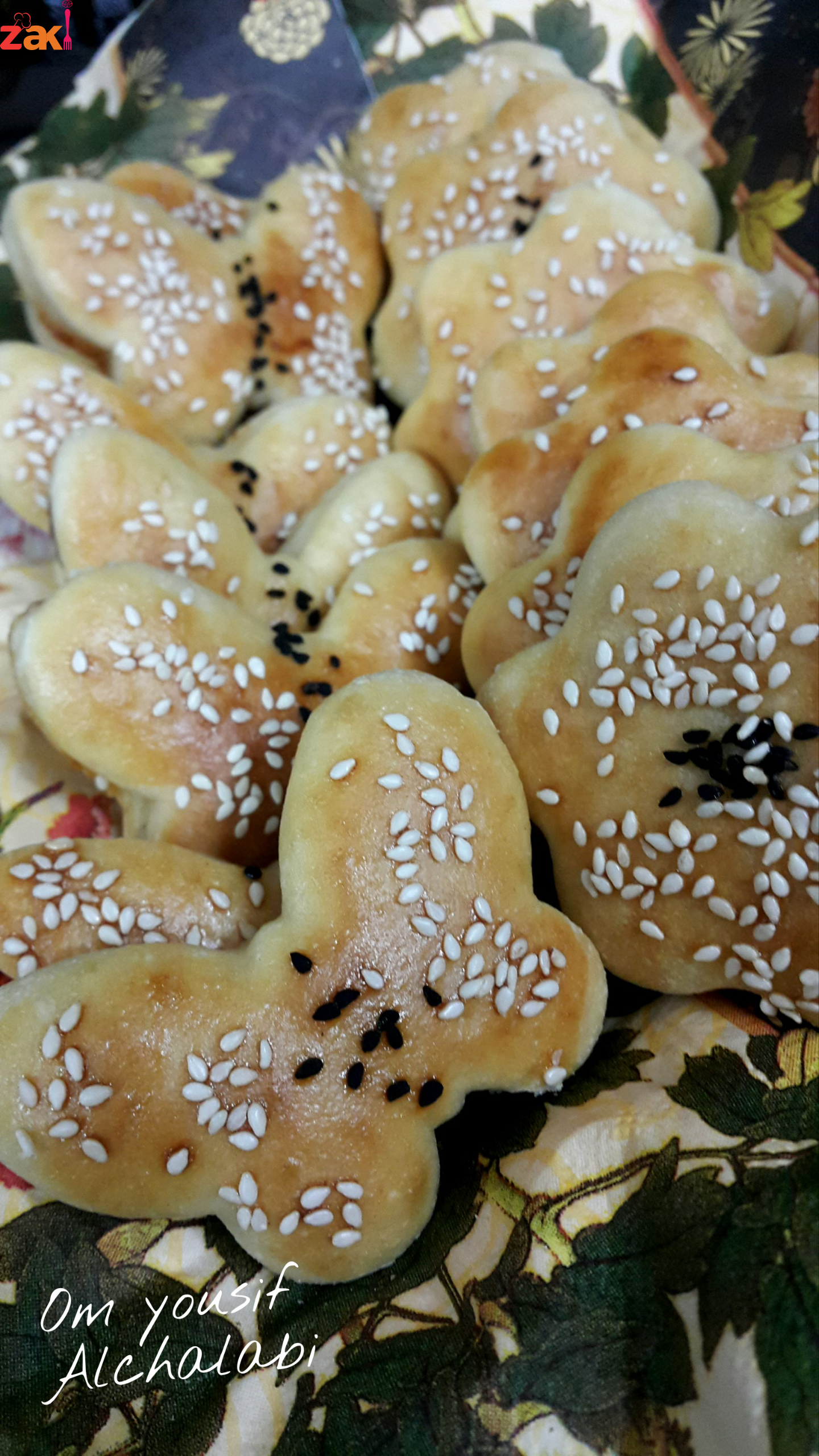ثم يمسح الوجه بالبيض المخلوط بملعقةحليب باودر وملعقة كبيرة سكر ويرش السمسم ثم تدخل فرن حار لمدة 15 الى 20 دقيقة