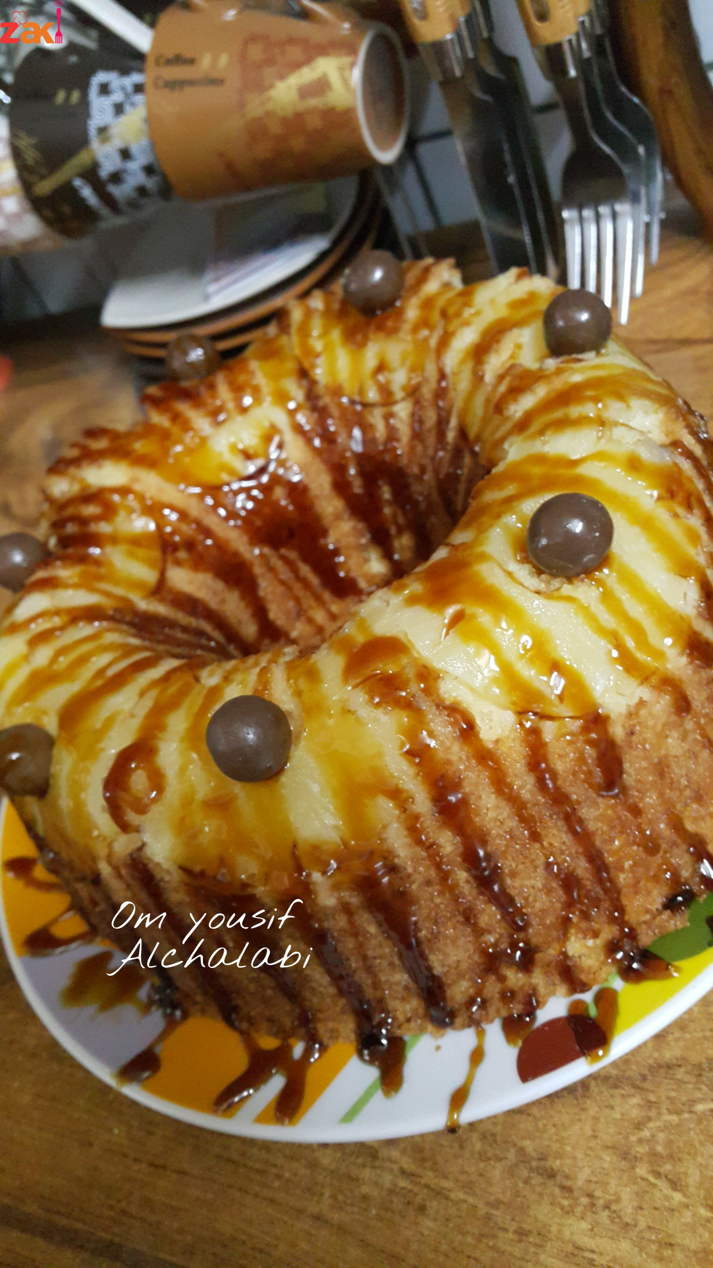 العمل … يخلط البيض والفانيلا مدة خمس دقائق ثم نضيف السكر بشكل خيط رفيع ويخلط خمس دقائق اخرى ثم نضيف الطحين المنخولوالمخلوط مع الحليب الباودر والبيكنك باودر وماء الاناناس بالتدريج ويخلط بالملعقة للتجانس ؛؛ يدهن القالب بالزيت ويرش قليل من الطحين وتصف قطع الاناناس عليه ثم نضع الخليط تدخل فرن حار لمدة 45 دقيقة على درجة 150 ثم تخرج وتترك لتبرد تماما مدة 20 دقيقة ثم تقلب وتزيين بالكرميل وتقدم ومليووون عافية لاتنسوو ذكر والدتي بالرحمة والدعاااء ام يوسف …