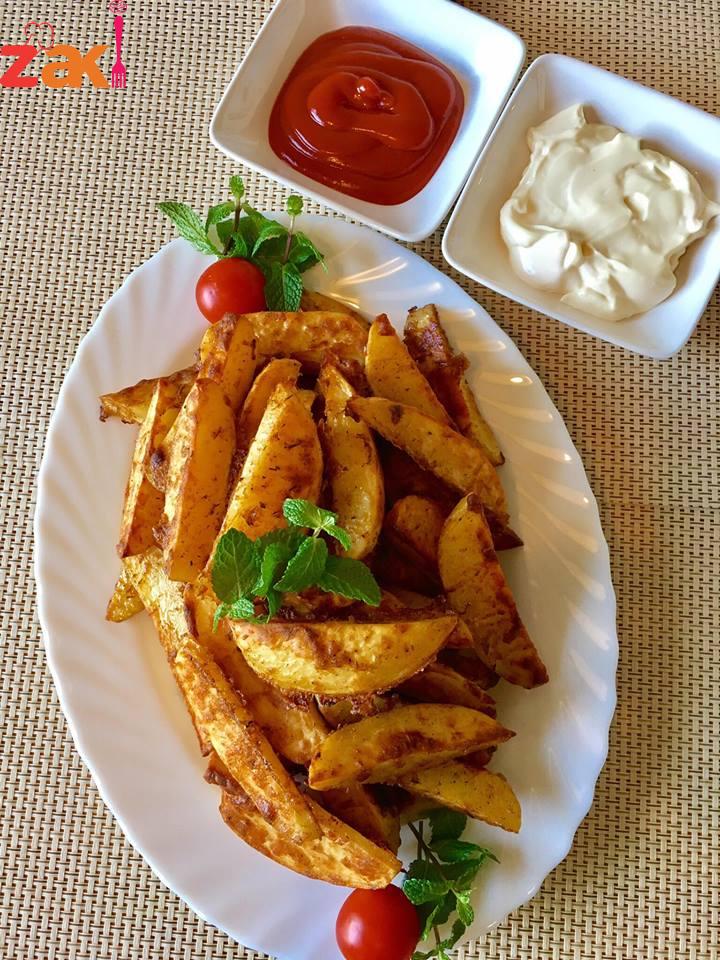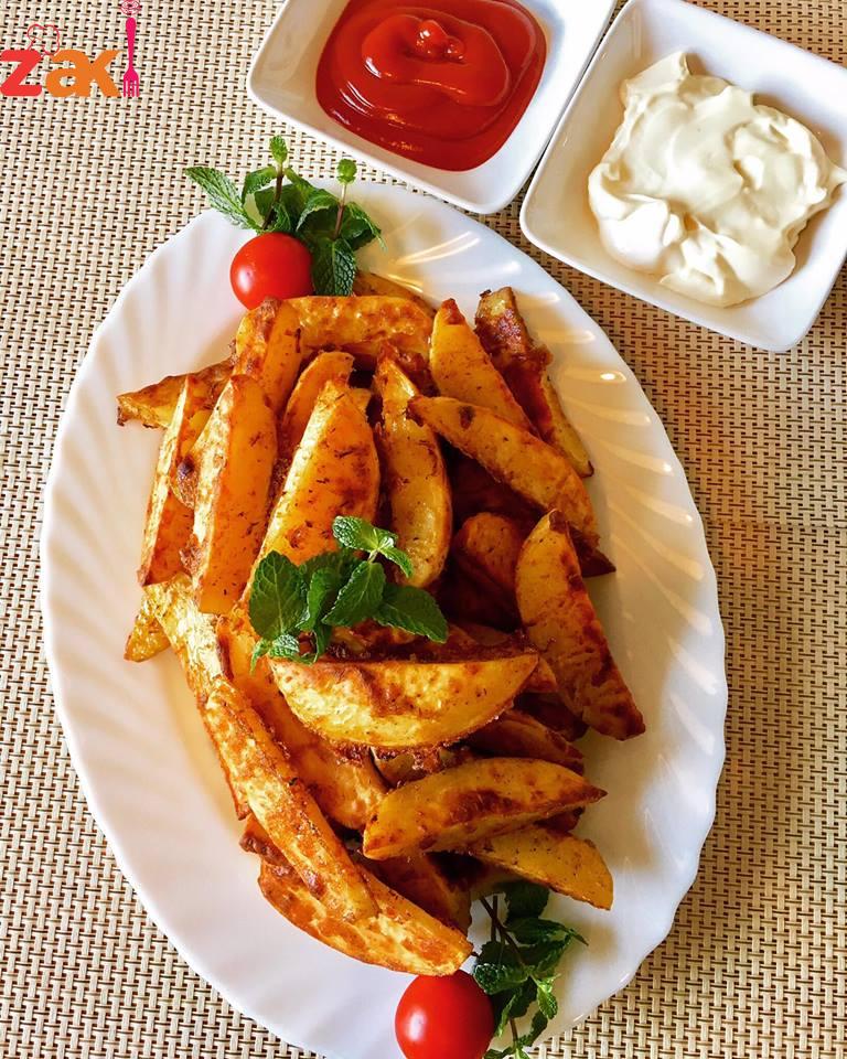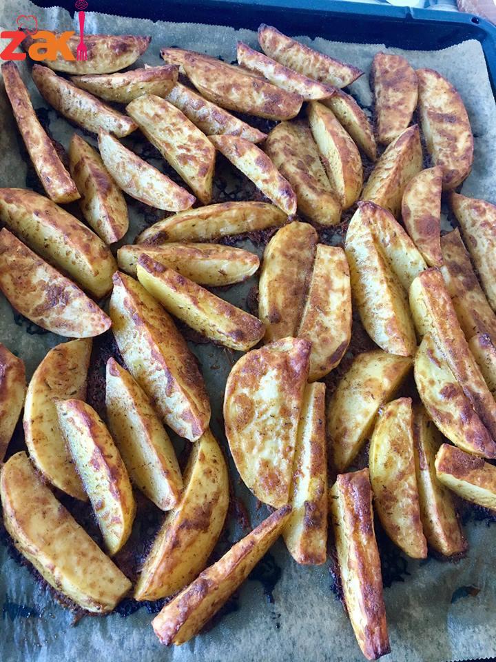 نقطع البطاطا اجنحه ممكن بقشرها او بدون ، ونخلط جميع البهارات والزيت جيدا ونضعها في صينيه وتشوى على درجه حراره عاليه وتقدم ساخنه