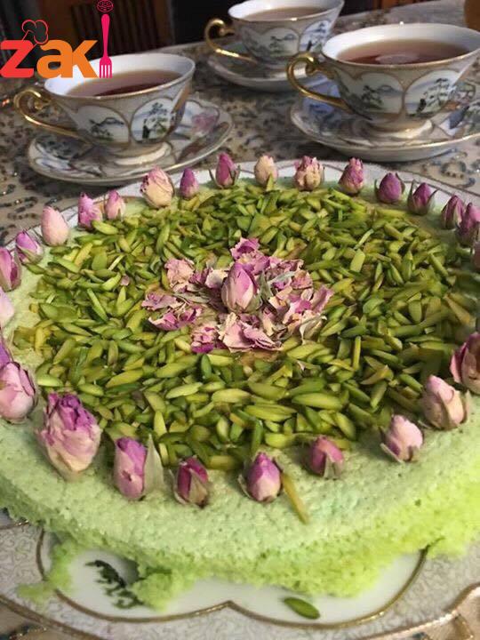 نطفى الفرن ونفتح باب الفرن نتركه يبرد تماماً قبل ان نضعه بالبراد لعده ساعات ثم نزينه بالفستق الحلبي انا وضعت عسل لتثبيت الفستق والورد الشامي او حسب ذوقكم قدمته مع الشاي المعطر بتمنى ينال اعجابكم كفكرة ضيافه