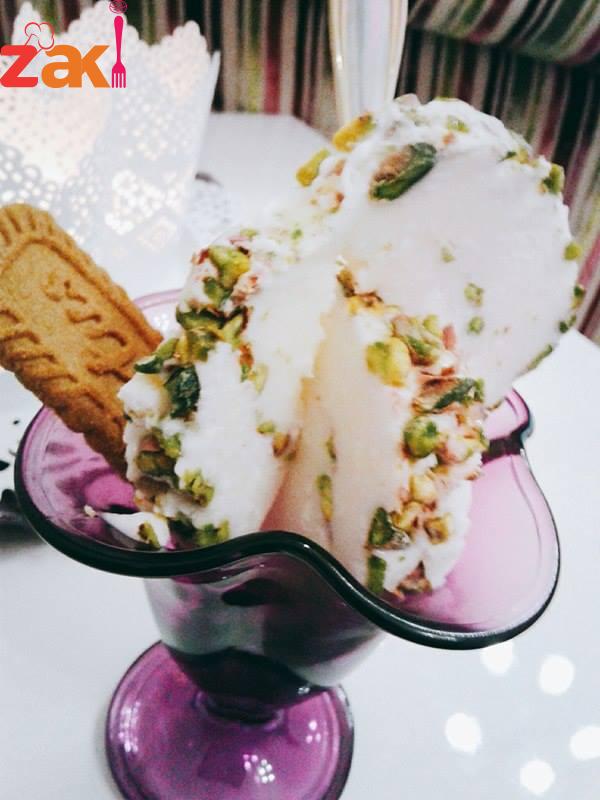 ملعقة صغيرة مستكة ناعمة جبنة ريكوتا كاستين . قشطة قيمر علبة كبيرة . خمس معالق نشأ اخضر أو نشأ بودرة فستق حلبي للزينه وبداخل البوظة .حسب الرغبة ..الكمية .