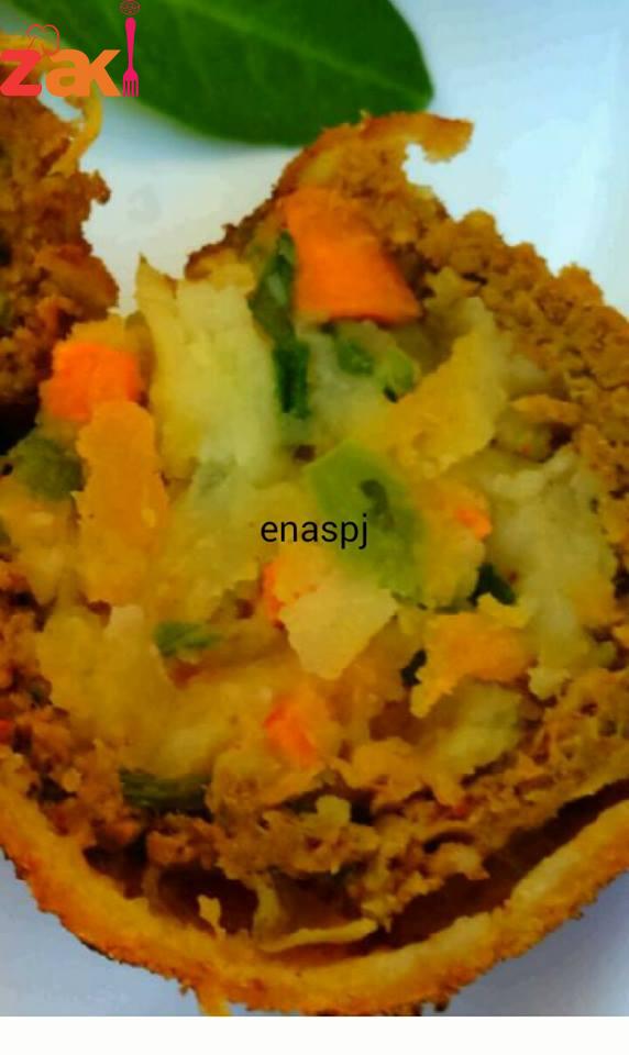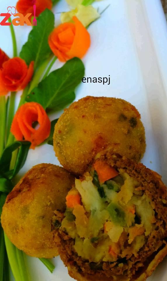 بطاطا مسلوقة ومهروسة حوالي ثلاثة أكواب ضيفيلها بيضة وجبنة فريكو نصف كوب مع شوية فلفل رومي ألوان وجزر مقطع ناااعم وشوية ملح شكليها كور وحطيها في الثلاجة بعد أن تتماسك غلفيها بطبقة من اللحم المفروم مع شوية كزبرة وبقدونس وبصل وملح وفلفل وبهارات.