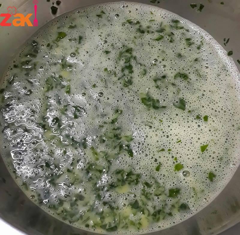 ومنزيد عليهم 3 كوب ماء ومكعب ماجي ورشة كركم وملح وملعقتين سمنه للنكهه وعلى الغاز منضلنا نحرك فيهم لحتى يغلوا حتى ما يفرط اللبن . (الخطوة الثالثه) منخلط البيض مع البقدونس