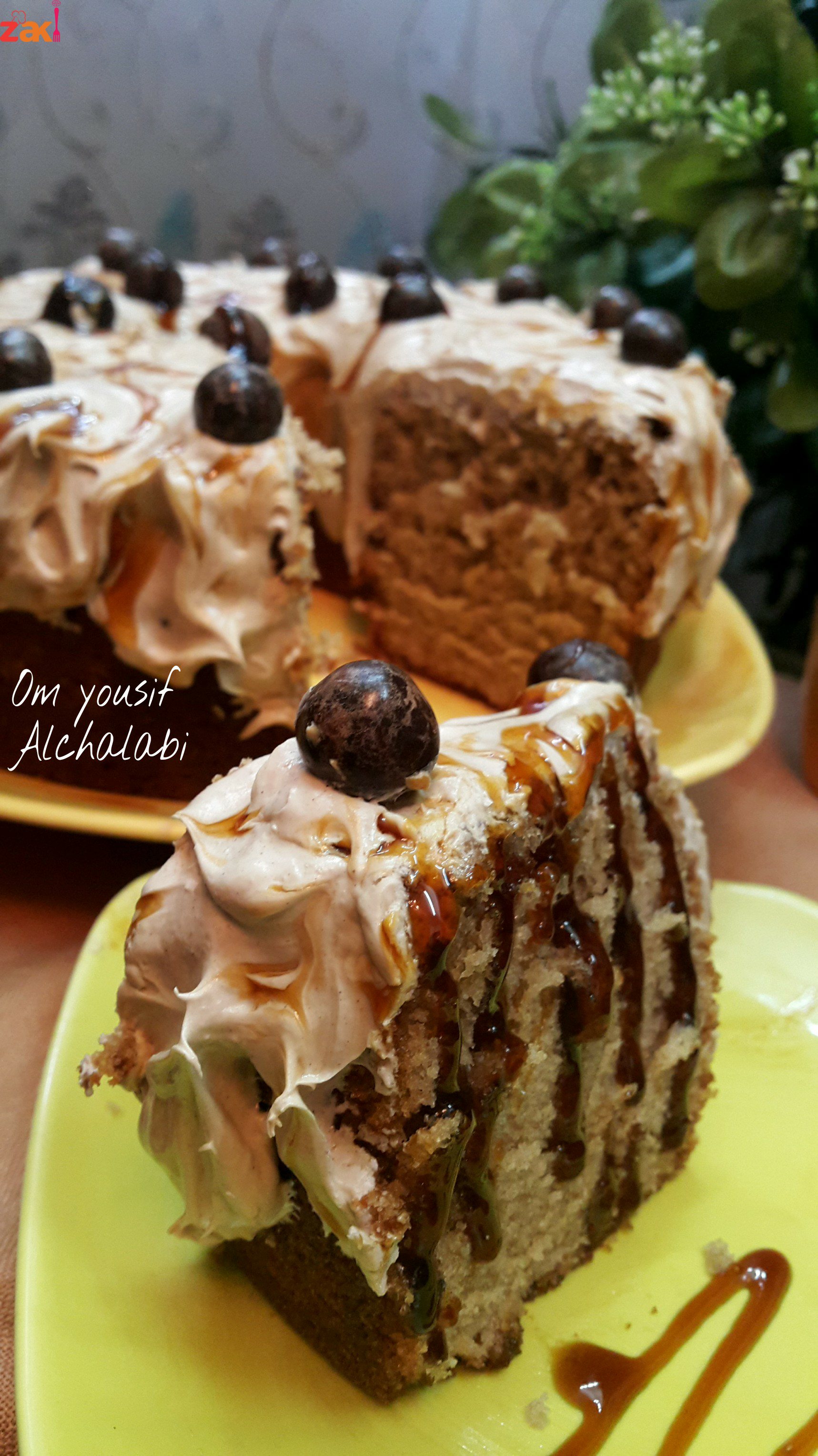 ثم نضيف الطحين والحليب بالتدريج واخيرا نضع البيكنك باودر وتخلط بالملعقة وتصب في قالب مدهون ومرشوش بالطحين وتشوى مدة 45 دقيقة تترك لتبرد وتقلب وتزيين ب كريمة النسكافيا