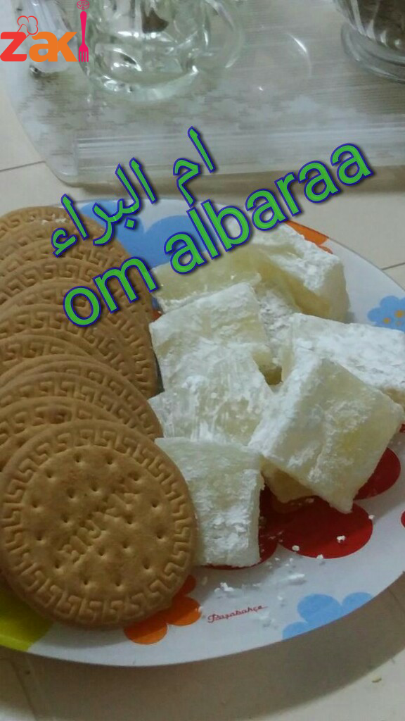 ونضعهم مثل الخيط بهدوء مع التحريك المستمرليخلص مقدار النشا ونستمر 10دقايق ثم نضع مقدار ملح اليمون التاني ونحرك ثم فنجانين السكر ونستمر نصف ساعه مع التحريك ثم المستكه وماء الورد ثم نختبر الراحه في ماء بارد اذا تكورت وجمدت نتذوقها ونختبر مطاطيته ثم ندهن كيس نيلون زيت ونسكب لخليط ويترك يبرد ثم يقطع حسب زوق. ام. لبراء. لا اله الا الله محمد رسول الله