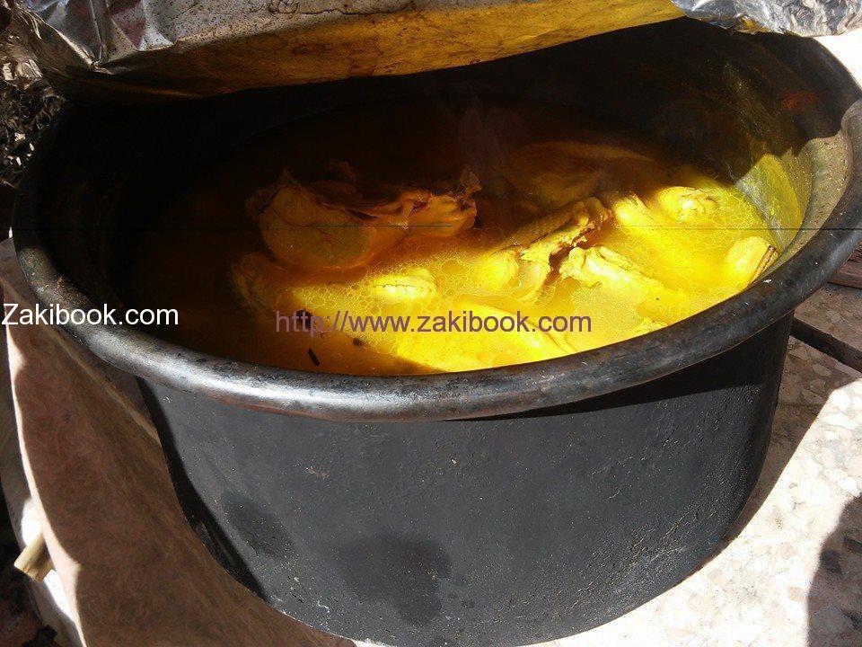– نغلي الدجاج بالماء والملح والهيل وكميه كبيره من الكركم سن توم ونتركه حتى يستوي.