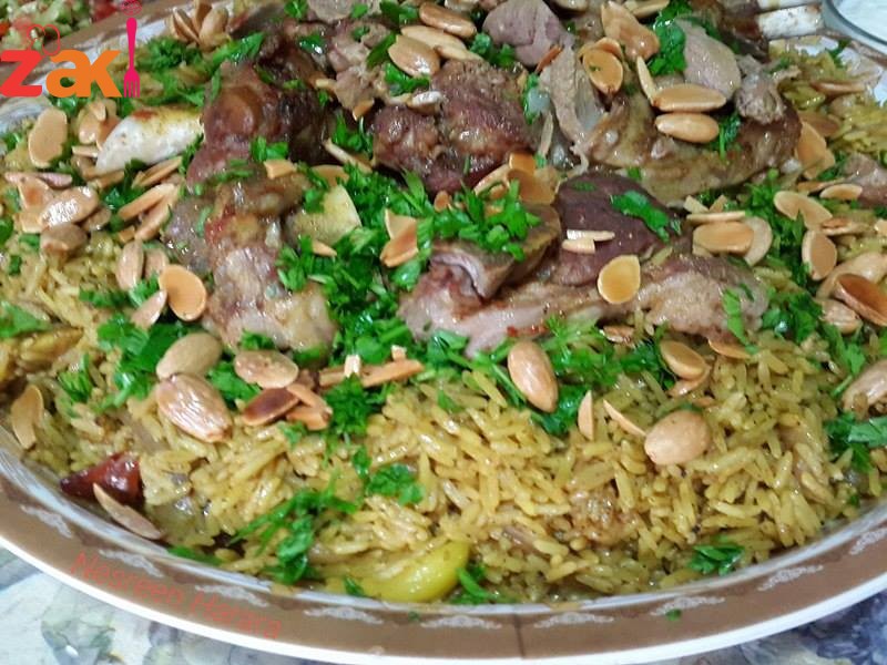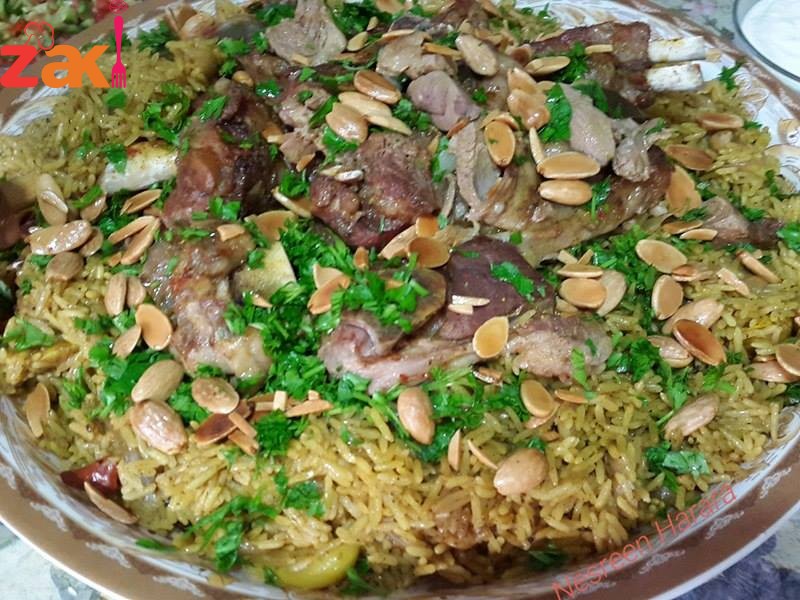 هلق بحط اللحمة المسلوقة بصينية و الكاس الي شلناه من المرقة المبهرةبصبه فوق اللحمة ونحطها بالفرن لحتى تاخد لون وتتنكه وبنصب الرز وفوقه اللحمة وبنزين باللوز وشوية بقدونس مفروم وراح يطلعلك اطيب قدرة بالف هنا عقلبكم