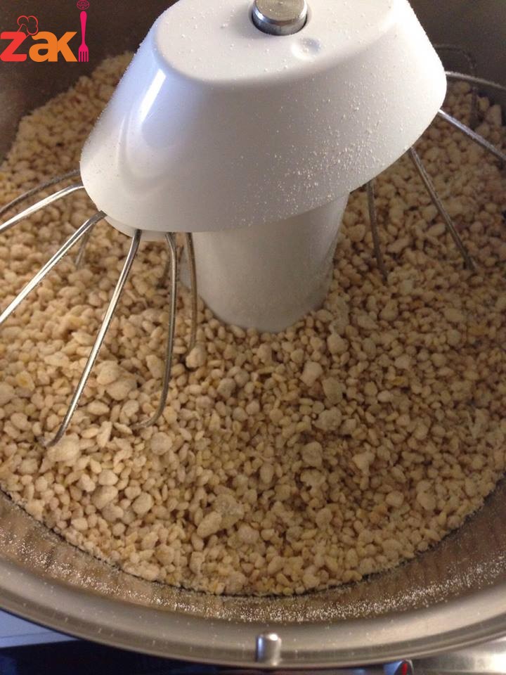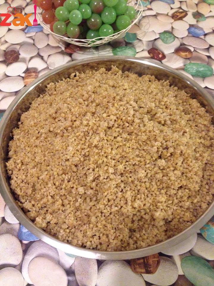 بعد نقع البرغل وتصفيته من الماء جيدا نضع قسم منه في صينيه ونرش عليه القليل من الطحين ونتأكد انه توزع على جميع الحبات نضعه في ماكينه الخفق الكهربائيه وليس اليدويه ويفضل ان يكون لها غطاء حتى لا تتطاير الحبات عند التشغيل