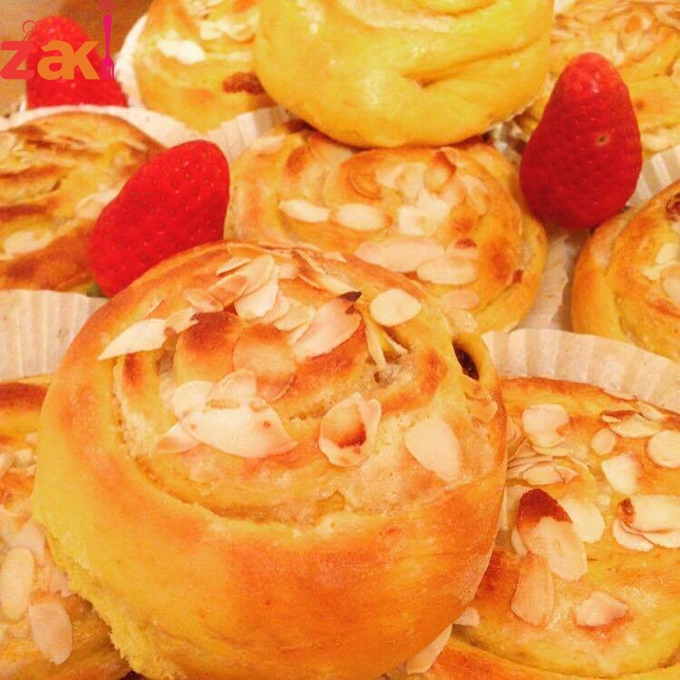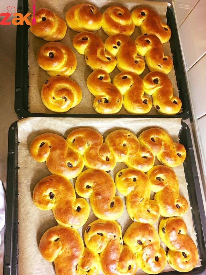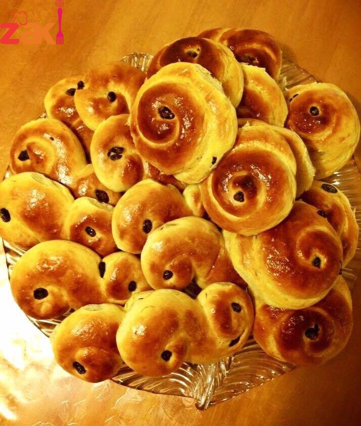 ثم نبرمها بالطول ونلف كل جهه عكس الاخرى، وبالنسبه لشكل الاخر نفرد مستطيل وندهن حشوه اللوز ونرش الزبيب الاشقر او الاسود ونلفها متل السينابون وندهن الوجه ونرش شرائح اللوز وتخمر حتى يتضاعف حجمها ثم تخبز.