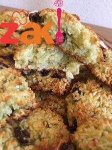 نهرس حبه الافوكادوا ونضيف البيض والفانيليا ونخفق نضيف المحلي وجوز الهند وباقي المواد ونخفق واخر شي الزبيب على صينيه مبطنه ورق زبده وهذا مهم وباستخدام الملعقه نوزع الاقراص نخبزها على حراره وسط حاى لاينحرق جوز الهند وعند الاستواء تبقى بالصينيه حتى تبرد تماما وتتماسك يحفظ بالبراد .