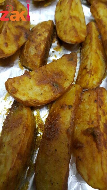 رتبي اصابع البطاطس بحيث تكون جهة القشرة الى أسفل في صينية الفرن