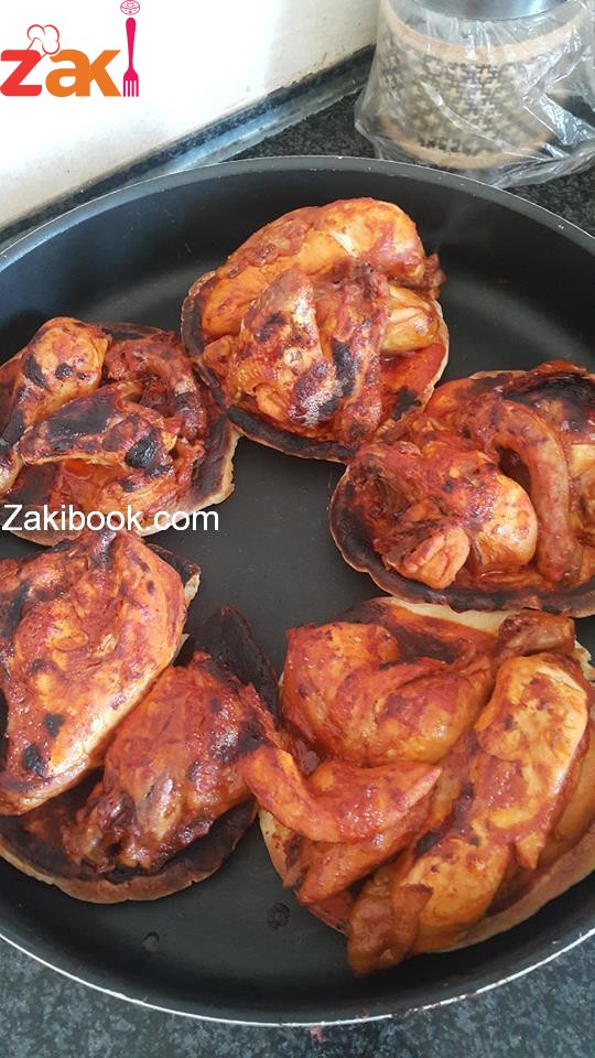 ثم نحضر ارغفه الخبز وندهنها من الجزء الخلفي بلخليط الذي تركناه بلبدايه ثم ندخلها الفرن حتى تصبح مقرمشه بشكل معقول ثم نضع قطع الدجاج على الارغفه وندخلها الى الفرن مره اخرى حتى يتحمر الدجاج لثواني معدوده وتقدم بألف صحه وهنا