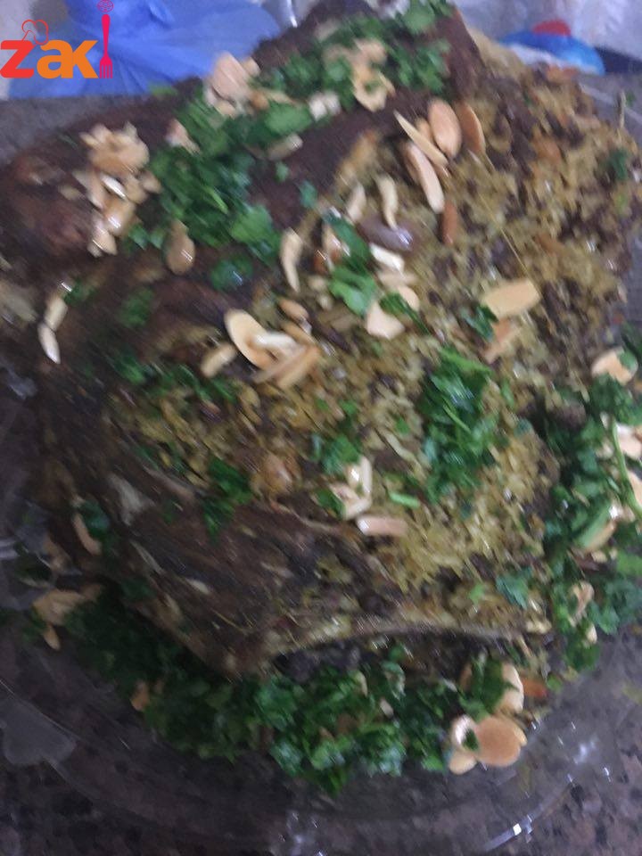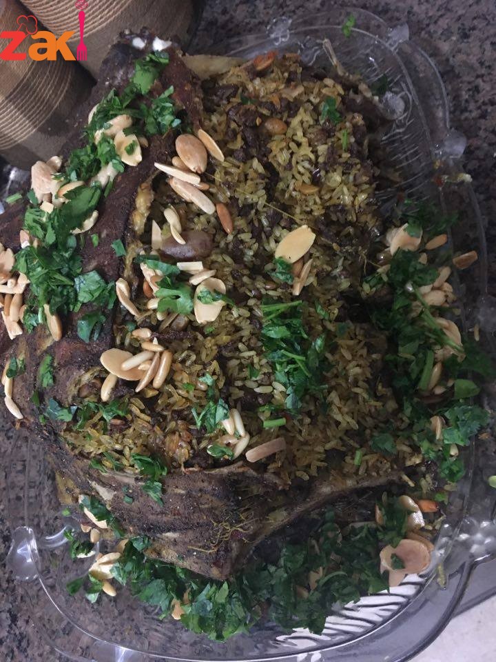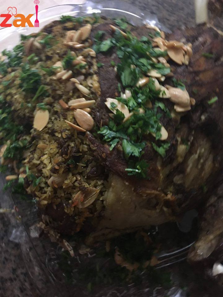 تشوح اللحمة المفرومة بالزيت وتضاف المكسرات وتخلط باقي البهارات مع الرز وتضاف للحمة وتحشى الضلعة ثم تخاط وتوضع في صينية وتغرز بالسكين يضاف ماء ساخن تغطى بالقصدير جيدا وتدخل الفرن على درجة حرارة ١٨٠ مدة ٣ ساعات