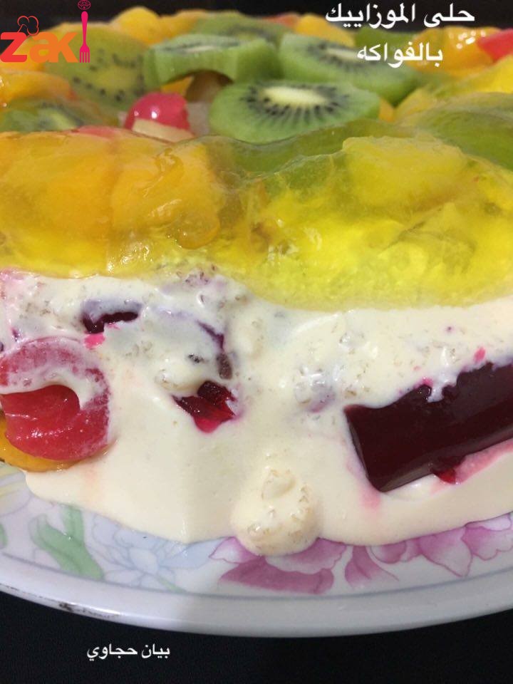تضاف مكعبات الجلي وباقي الفواكه ثم يضاف باقي خليط الحليب
