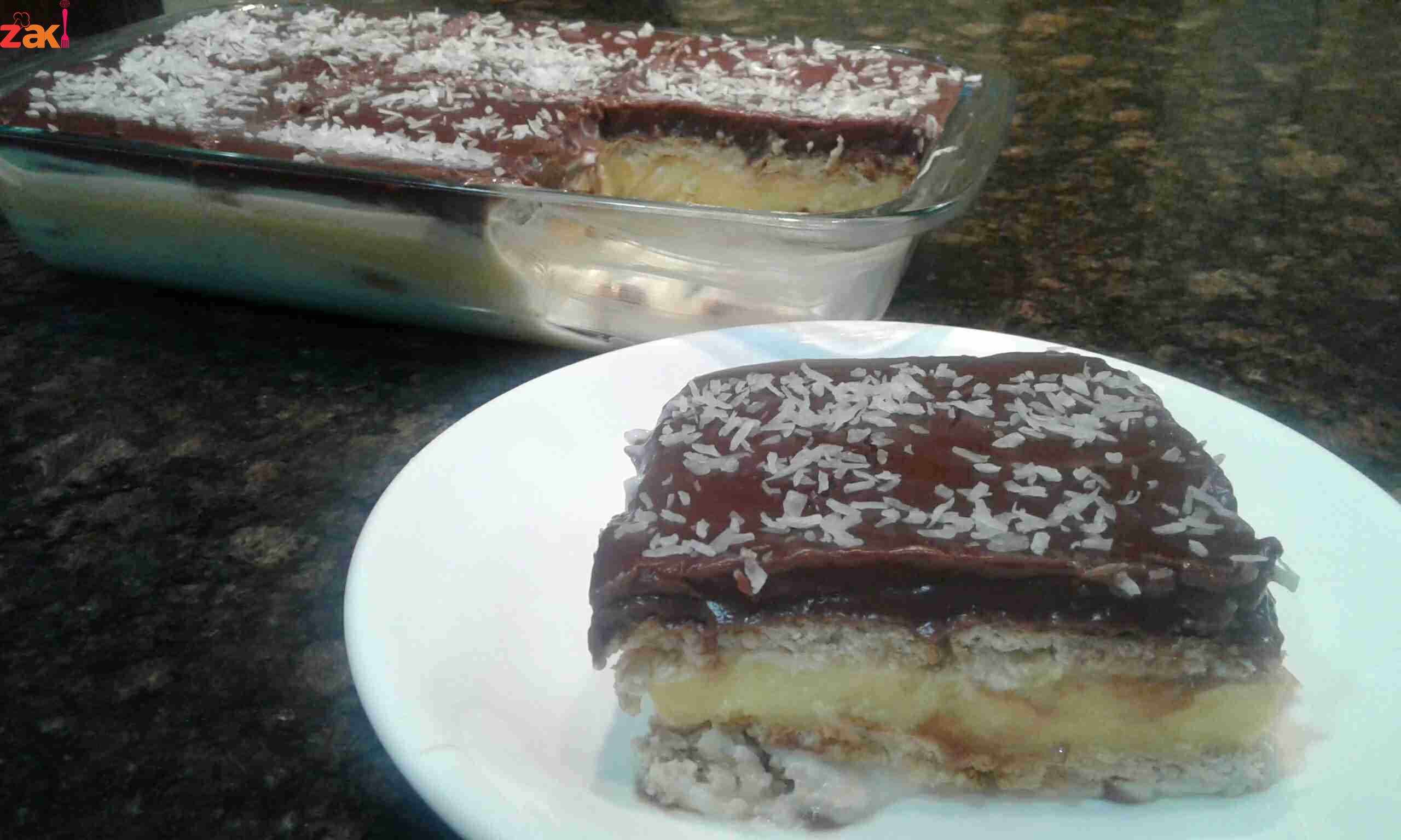 الطبقة الثانية على الغاز نضع كاس ماء وثلاث ملاعق حليب وملعقة سكر حتى يغلي نضع الكاسترد مخلوط بالماء مع التحريك حتى يثخن نضعه فوق الطبقة الاولى وبس تبرد نضع فوقها باقي القشطة ثم بسكوت
