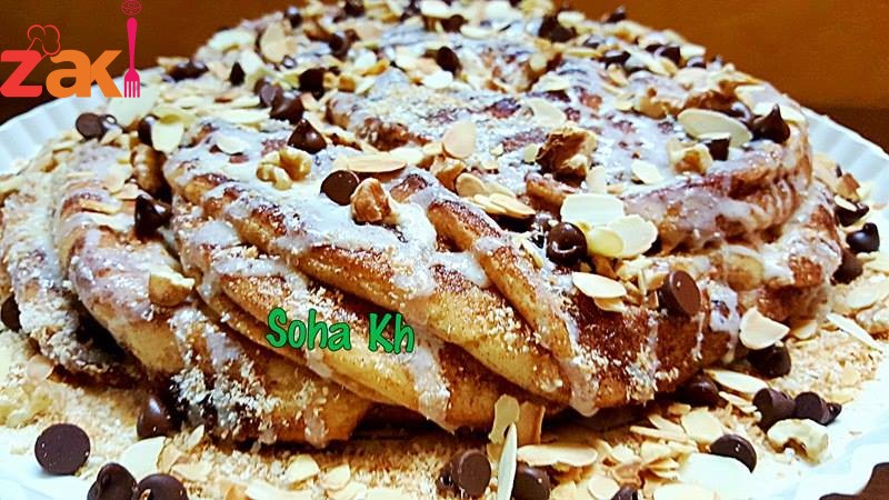 ثم يرش السكر والقرفه وتلف بشكل رول ثم يقطع الرول بشكل طولي ويلف بشكل حلزوني الطبقات للاعلى وتوضع بصنيه الخبيز وتغطى وتترك ساعه لتخمر