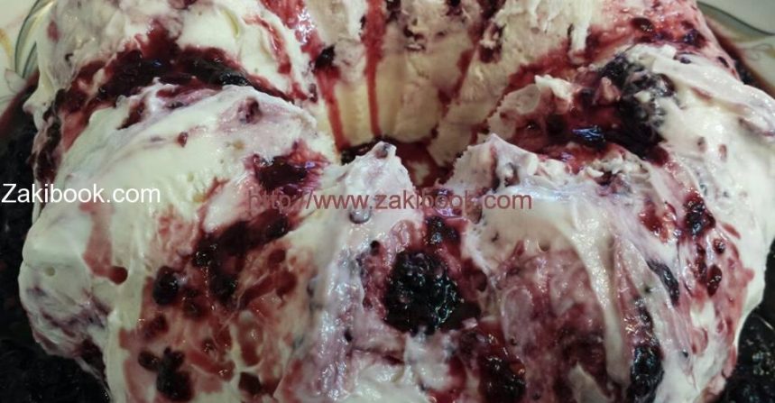 – نصب الخليط في قالب, ونضعه في الفريز لليوم الثاني, وممكن نقدمه بأخذ مغرفة منه بواسطع ملعقة البوظة, لكن أنا وضعته في قالب من السيليكون وقلبتو مثل الكيك, وزينتوا بصوص مربى التوت, وصحة وألف عافية.