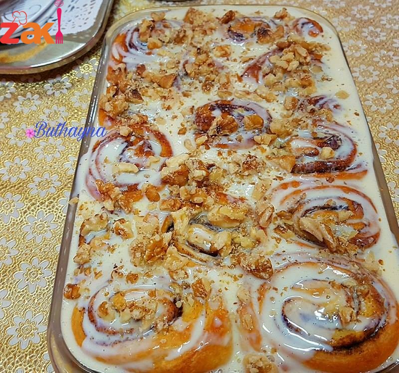وبعدين بفردها مستطيل لسهولة العمل انا بقسمها على مرتين بدهنها زبدة وسكر وقرفة وجوز. عين جمل بنلفها رول وبنقطعها وبنحطها بجاط بنتركها تتخمر كمان مرة لمدة ساعة وبنخبزهالحتى تحمر
