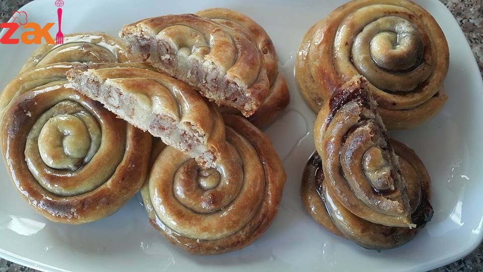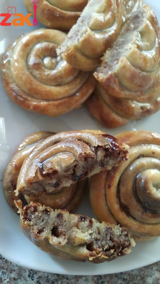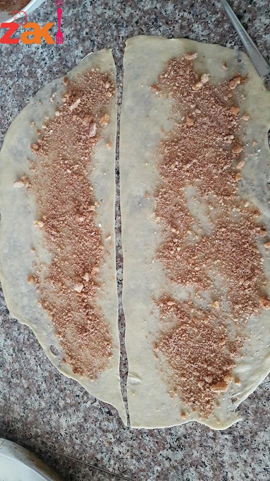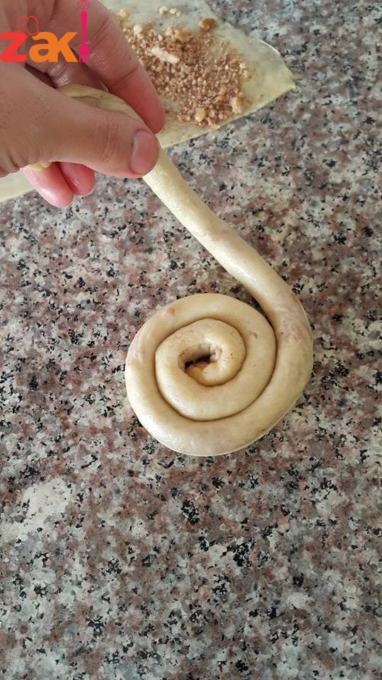 وحطي على كل جزء حشوة عبارة عن جوز وقرفة وسكر مطحون متل حشوة القطايف ولفيها رول للامام وبعدين لفيها على بعض وحطيهم كلهم بسدر مدهون زيت