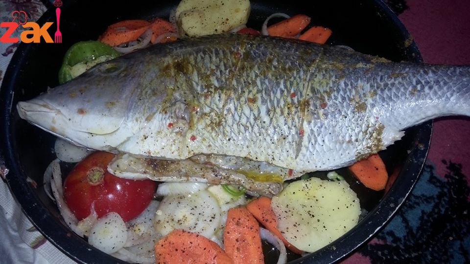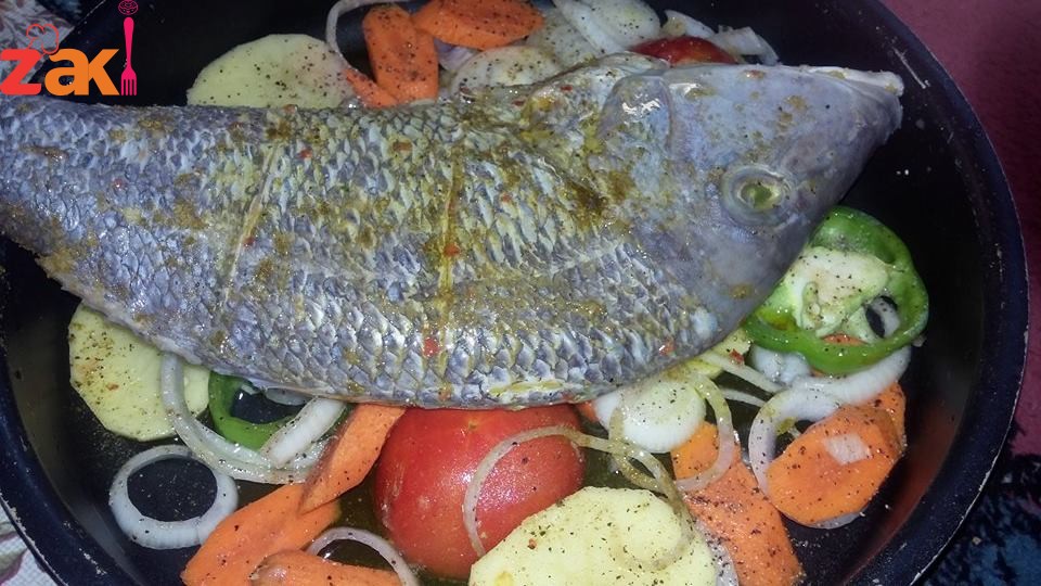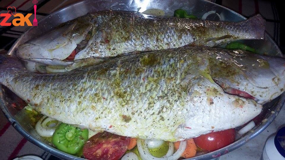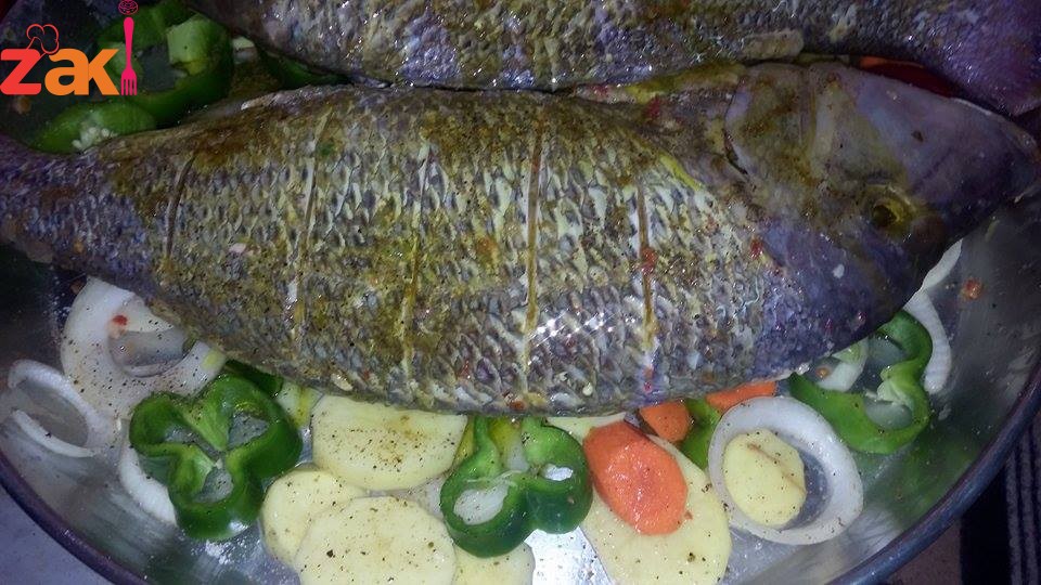 ينظف السمك جيدا ويتبل قبل بيوم ب:يدق توم وفلفل حار وملعقه شطه وملح وفلفل وملح ليمون وكمون وتاني يوم يدق توم وبقدونس وتنحشى بالسمكه وبالشرحات وفي صينيه يفرم بصل وبطاطا وجزر وفلفل حلو وتطبخ بالفرن لحد الاستواء وتحمر .