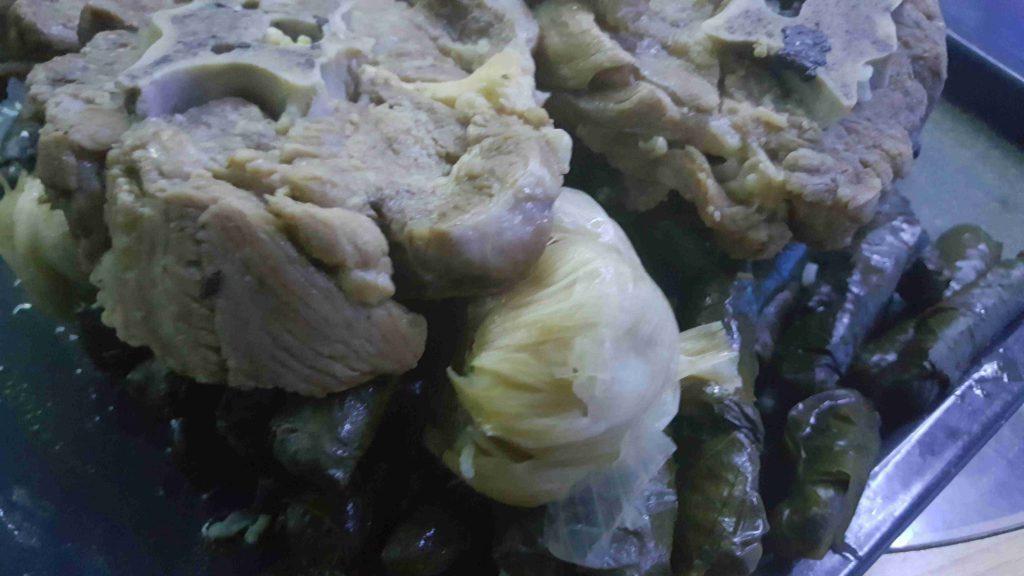 منلف الورق لنخلص الكميه منصف بكعب الطنجره اللحمه وفوقا الثوم ومنصف الورق فوق ومنحط عصير الليمون ومي سخنه عم تغلي ومنركز الملح ومنتقل الطنجره مشان مايفلت الورق منخليا تغلي مع التقل عشر دقايق بعدين منشيل التقل ومنغطي الطنجره منخفف الغاز على الاخر بدو ساعتين لساعتين ونص على النار بس يستوي منقلبو وصحه وهنا للجميع