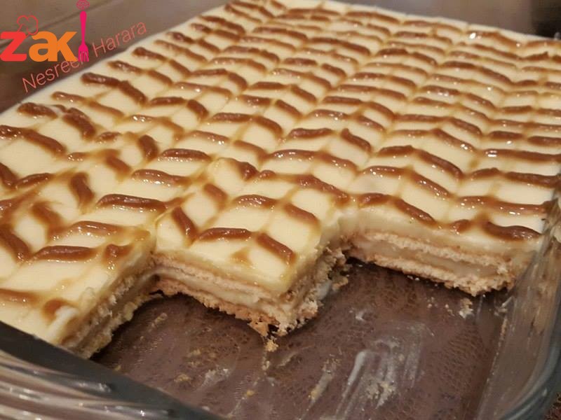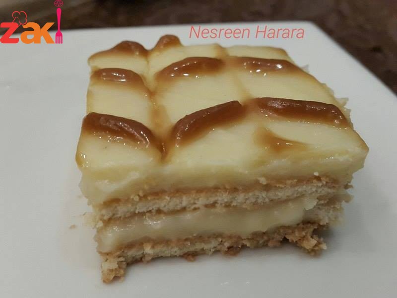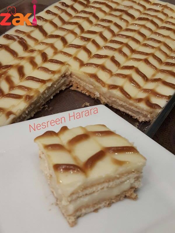 اول طبقة بسكوت مسقى حليب او نص كافيه والطبقة الثانية في الخلاط نضع بيضة ومعلقة فانيلا صغيرة وربع معلقة برش ليمون ونص كاس سكر او كاس حسب الرغبة ونضع خمس كاسات حليب سائل وكاسة طحين (نستعمل نفس الكاسة بالعمل) نخلط المكونات جيدا مدة خمس دقايق