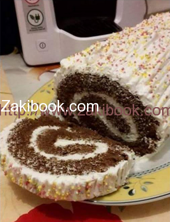 – اول مانخرجه من الفرن نقلبه علي منشفة مطبخ نظيفة ونتركه خمسة دقائق تم نلفه بالمنشفة لف السويسرول تم ندخله التلاجة ساعة علي الأقل.
